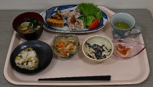 刈谷市立小高原小学校 6年 西尾 楓実(にしお ふみ) 大根菜としらす混ぜおにぎり、豚しゃぶの梅肉ソースのせ、野菜キッシュ、切り干し大根の煮物、フレッシュサラダ、あさりの味噌汁、れんこんとひじきのゴママヨ和え、いちじく、西尾のお茶 |