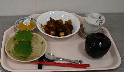 西尾市立西尾小学校 5年 石川 芽衣子(いしかわ めいこ) 米粉まっ茶むしパン(アーモンド入り)、西尾まっ茶がけ大学いも、愛知県産しじみ汁、手作りソースのバナナ豆乳ヨーグルトがけ