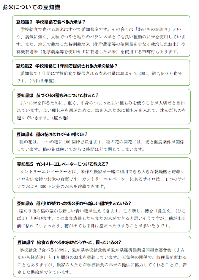 | 白飯 | 精米は全て愛知県産「あいちのかおり」を主体とした品種を使用しています。 |