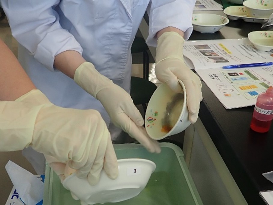 - 調理場で実際に使用している食器、食器具のでんぷん、油、ATPを調べることができ、洗浄状態を振り返ることができました。調理員さんにこの結果を伝え、2学期以降の調理作業に役立てていきたいと思います。