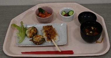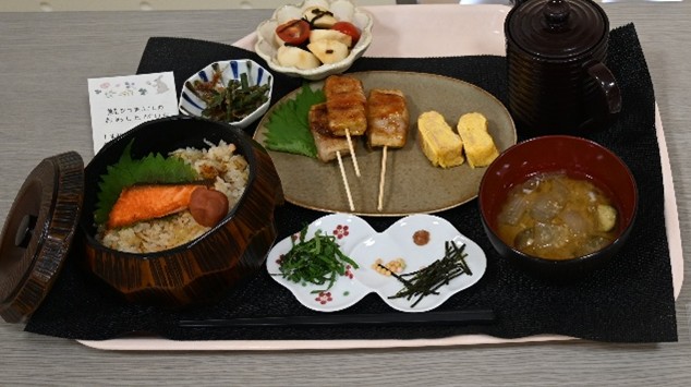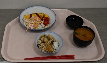 鮭と切り干し大根のひつまぶし、角麩の肉巻き、納豆卵焼き 十六ささげのおかか和え、