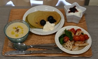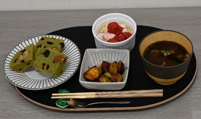 西尾市立西尾小学校 5年 石川 芽衣子(いしかわ めいこ) 米粉まっ茶むしパン(アーモンド入り)、西尾まっ茶がけ大学いも、愛知県産しじみ汁、手作りソースのバナナ豆乳ヨーグルトがけ