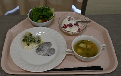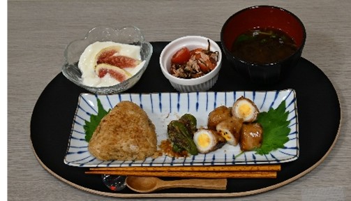 刈谷市立小高原小学校 6年 西尾 楓実(にしお ふみ) 大根菜としらす混ぜおにぎり、豚しゃぶの梅肉ソースのせ、野菜キッシュ、切り干し大根の煮物、フレッシュサラダ、あさりの味噌汁、れんこんとひじきのゴママヨ和え、いちじく、西尾のお茶 |